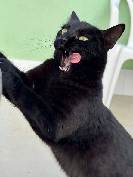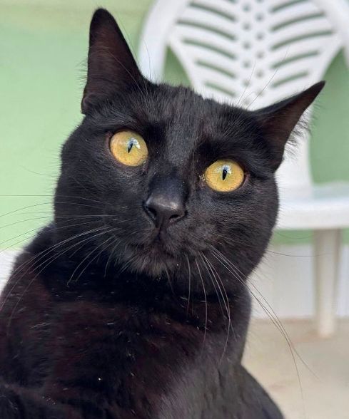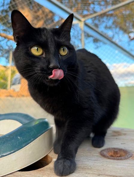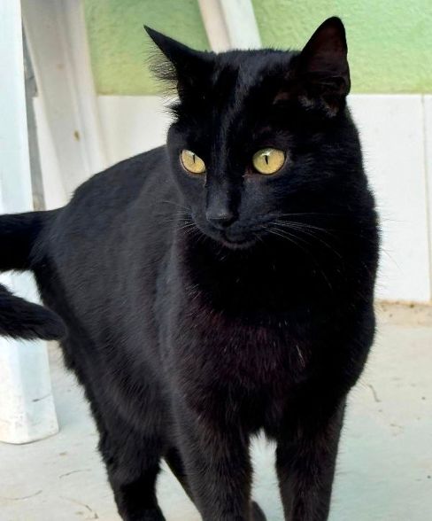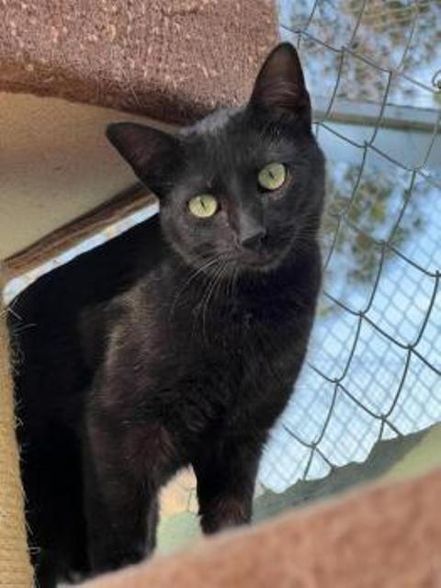 Bonnie ist ein noch ganz junges Katzenfräulein; sie wurde ungefähr im Juni 2022 geboren. Sie hat ein komplett schwarzes Fell und wunderschöne große Augen.