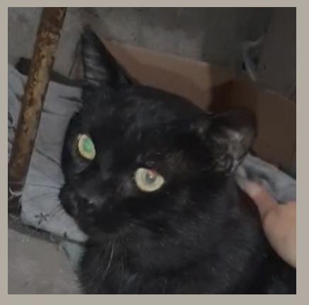 Ein wunderschöner schwarzer Kater, der aus irgendeinem Grund ein Vorderbein verloren hatte. Ich beobachtete ihn von weitem… Er war sehr scheu und wartete darauf, dass ich ging, damit er fressen konnte.