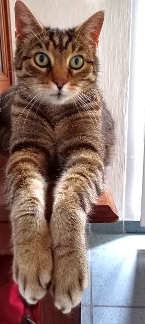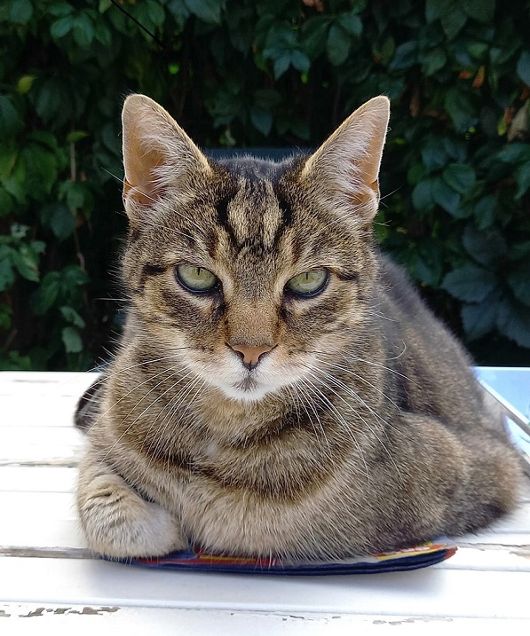 Sie ist fit und wendig, springt wie eine Feder und klettert über die Pflanzen-Rankhilfe oft rauf auf die Dachrinne, auf der sie dann ihren Kontrollgang macht.