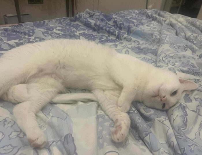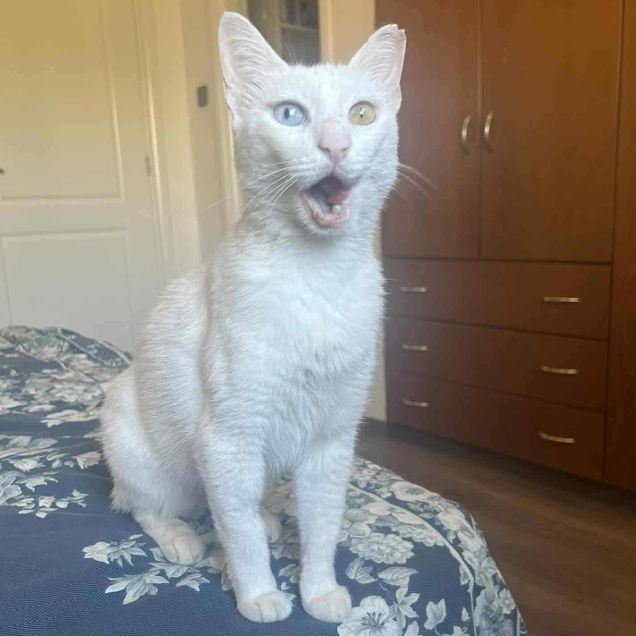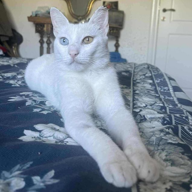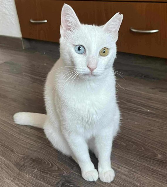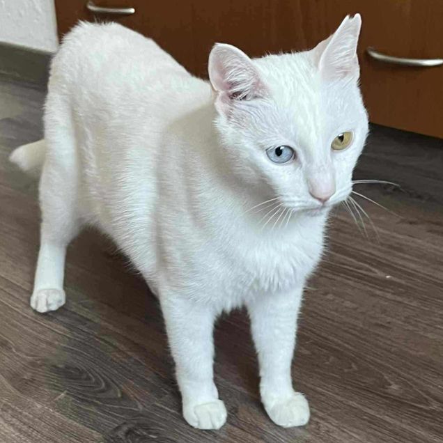 Die hübsche weiße Neko mit den zwei verschiedenfarbigen Augen wurde vor 6 oder 7 Monaten (Stand: 17.10.2025) auf der Straße in schlechtem Zustand gefunden, aber sie wurde gerettet, behandelt und ist nun gesund und munter. Leider ist sie taub, so wie es bei vielen weißen Katzen der Fall ist, und kommt nicht gut mit anderen Tieren zurecht. Daher wäre es super, wenn sie ein Zuhause finden würde, so dass sie alleine leben kann.
