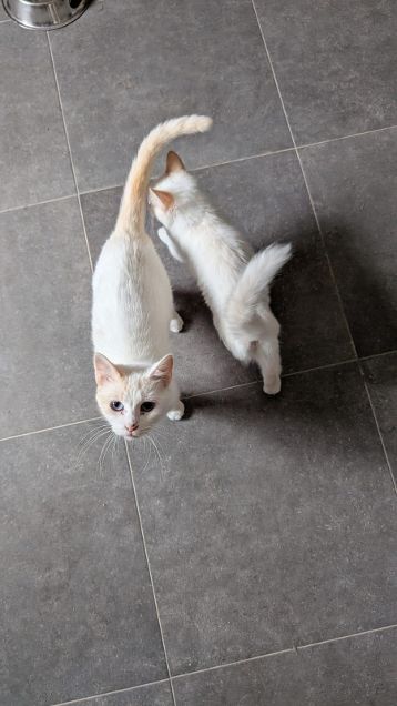 Elli und Peaches wurden vor der Haustür einer freiwilligen Mitarbeiterin ausgesetzt und befinden sich nun im Tierheim. Elli ist eine freundliche junge Katze, die sich mit weiteren Katzen und auch Hunden gut versteht. Sie soll idealerweise zusammen mit ihrem inzwischen blinden Kitten Peaches in Vermittlung gehen. Peaches hatte eine starke Augeninfektion was am Ende zur Entfernung beider Augäpfel geführt hat.