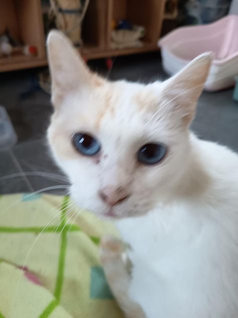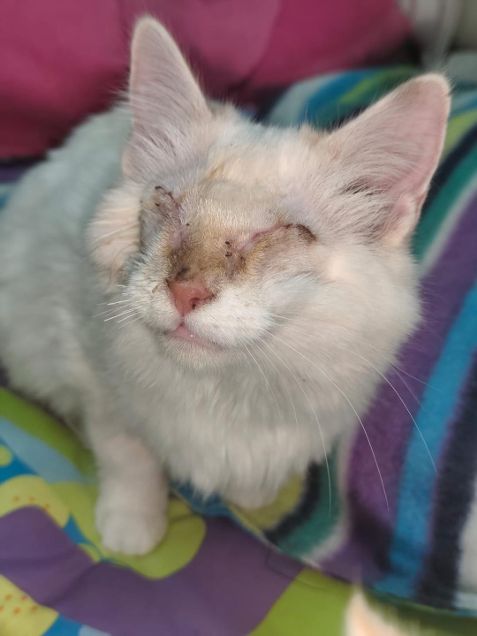 Elli und Peaches wurden vor der Haustür einer freiwilligen Mitarbeiterin ausgesetzt und befinden sich nun im Tierheim. Elli ist eine freundliche junge Katze, die sich mit weiteren Katzen und auch Hunden gut versteht. Sie soll idealerweise zusammen mit ihrem inzwischen blinden Kitten Peaches in Vermittlung gehen. Peaches hatte eine starke Augeninfektion was am Ende zur Entfernung beider Augäpfel geführt hat.